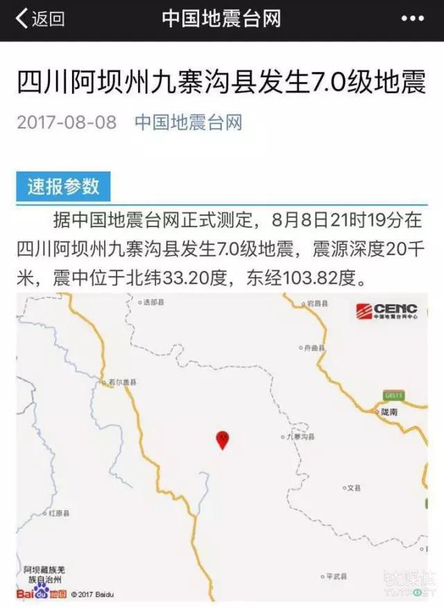 地震發(fā)生后的18 分鐘,由“中國地震臺網(wǎng)”官方微信推送了正式測定數(shù)據(jù):“根據(jù)中國地震臺網(wǎng)正式測定,8月8日21時19分,四川阿壩州九寨溝縣發(fā)生7.0級地震,震源深度20千米,震中位于北緯33.20度,東經(jīng)103.82度。”