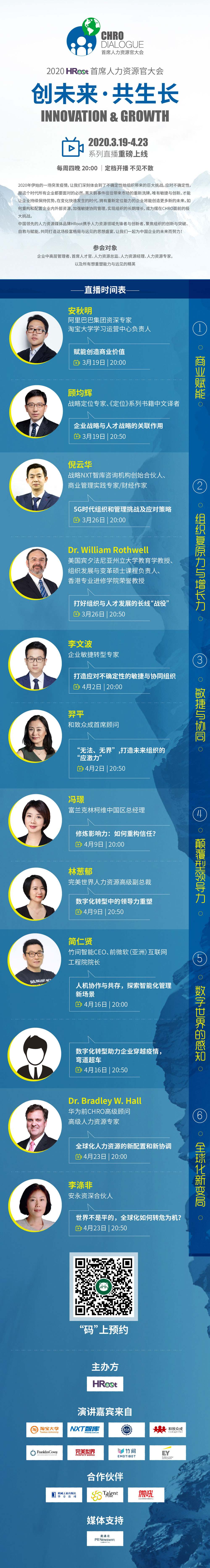 本次大會系列直播以“商業賦能 · 重構資源 · 長期增長”為主題,共邀請到了12位重磅演講嘉賓,主要為世界級的人力資源專家與學者,以及來自華為、阿里巴巴、安永、完美世界、富蘭克林柯維、NXT智庫、竹間智能、和致眾成等知名企業和領先機構的人力資源高管。