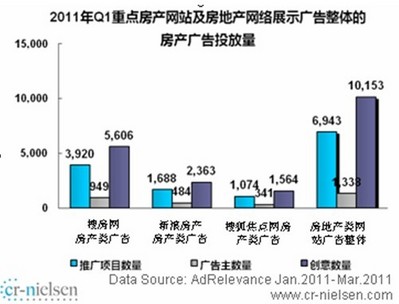 整體來看,房產廣告推廣項目數、廣告主總量、廣告創意數與去年同期相比都有大幅增長,其中房產廣告推廣項目數與去年同期相比增長113.4%,較為迅速。同時報告分析指出,房地產網絡展示廣告投放TOP3網站分別為搜房網、新浪房產、搜狐焦點網。報告顯示,2010年第四季度中國互聯網房地產行業展示類廣告推廣項目總量為10811個,其中搜房網是第二名2.5倍、第三名的3.5倍;2010年第四季度中國互聯網房地產行業展示類廣告廣告主總量為1734,搜房網以75.9%的份額大幅領先;2010年第四季度中國互聯網房地產行業展示類廣告創意總量為16597,搜房網以9563領先第二名和第三名3-4倍的優勢雄踞榜首。