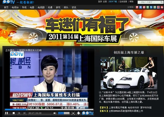 上海2011年4月25日電 /美通社亞洲/ -- 以“創新未來”為主題的2011第十四屆上海國際汽車展覽會于2011年4月21日-4月28日在上海隆重舉行。這是繼 PPTV 網絡電視連續4年成功直播車展后,再次以網絡電視直播新媒體的身份入駐本次上海車展第一現場。此外,PPTV 網絡電視上海車展專題頁面已首發上線(http://news.pptv.com/dsj/2011zt/2011shcar/index.html),第一時間全線報道本屆車展的四大精彩看點,讓廣大車迷們大飽眼福。