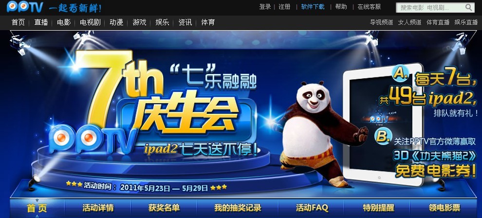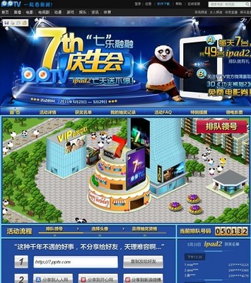 官網方面,用戶只要在5月23日 - 29日7天內登錄PPTV網絡電視官網,進入活動頁面點擊參與活動加入排隊流程便會得到一個排隊號,號碼每逢7的倍數即有機會參與抽獎。7天49臺 iPad2 火熱送出。微博方面,5月23日 - 27日期間,登錄官方微博,關注 PPTV 網絡電視分享活動信息或邀請7位好友前來參與本次活動,即有機會免費贏取 3D 版《功夫熊貓2》電影券以及7天免費的 PPTV 網絡電視 VIP 服務。