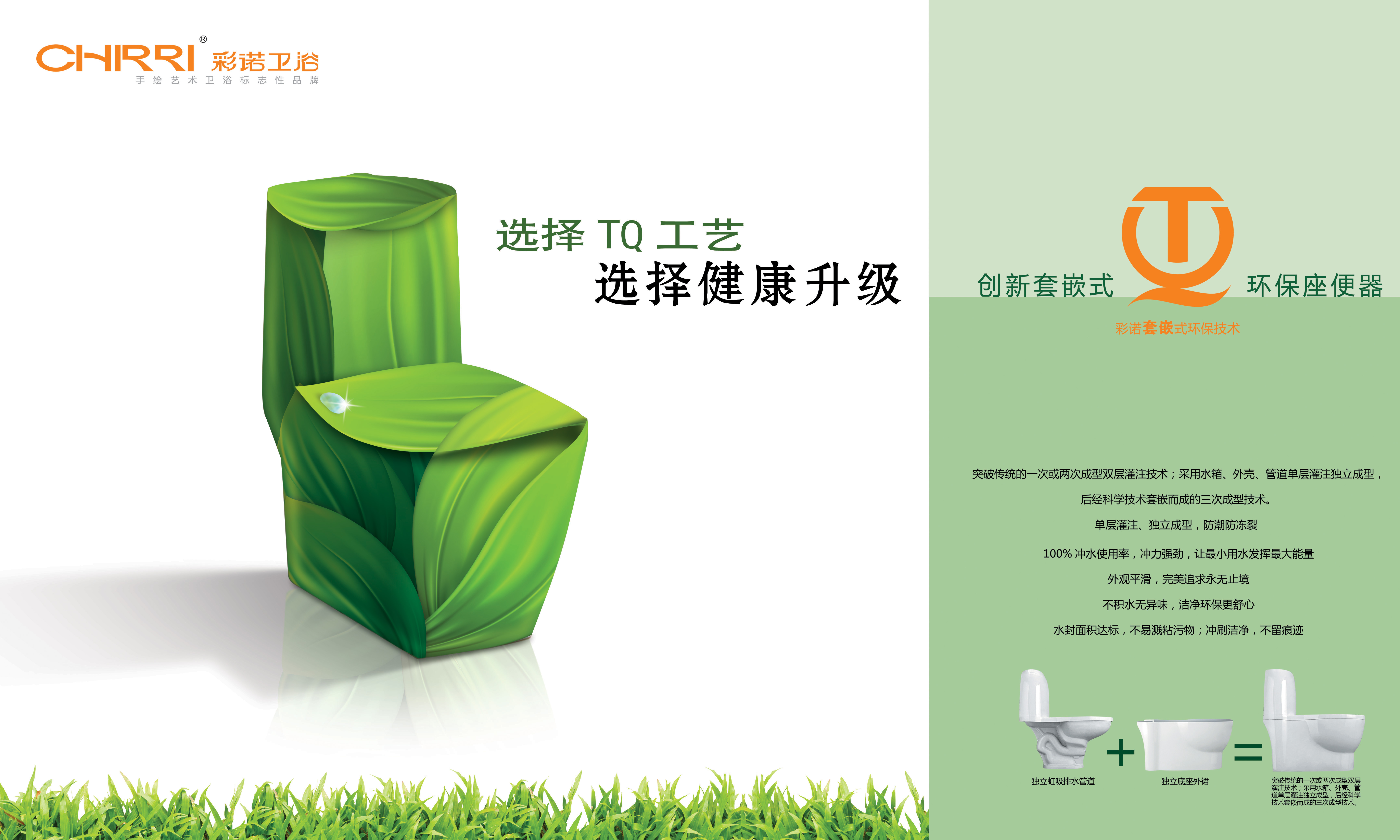套嵌式環(huán)保技術(shù)(也稱 TQ 技術(shù))是突破傳統(tǒng)的一次或兩次成型雙層灌注技術(shù),創(chuàng)造性地采用水箱、外殼、管道單層灌注獨(dú)立成型,后經(jīng)科學(xué)技術(shù)套嵌而成的三次成型技術(shù)。那么,為什么要單獨(dú)成型呢?彩諾衛(wèi)浴相關(guān)技術(shù)人員表示,普通的座便器因排水管體與外裙一起煅燒,在制作成型過程灌漿不到位極容易留下縫隙,長期使用或因天氣變化,便會產(chǎn)生微滲水和漏水,出現(xiàn)積水、結(jié)冰、凍裂等現(xiàn)象。而彩諾采用分體煅燒,獨(dú)立成型,管壁厚度均勻結(jié)實(shí)無縫隙,做到防潮防凍裂并完全杜絕漏水;作為消費(fèi)者普遍關(guān)注的節(jié)水問題也得到有效的解決,存水空間小使藏水量也大幅減少,按下水箱按鈕后水就直接往下沖,沖力更強(qiáng)勁,用最少的水發(fā)揮較大能量;并且在煅燒過程中受熱均勻,外觀線條更流暢,表面更平整美觀;而底座內(nèi)部無空隙,使用過程不積水,不容易滋生細(xì)菌,即便長久不用也不會產(chǎn)生異味,潔凈環(huán)保更舒心。正如套嵌式環(huán)保技術(shù)的形象口號:選擇 TQ 工藝,選擇健康升級。
