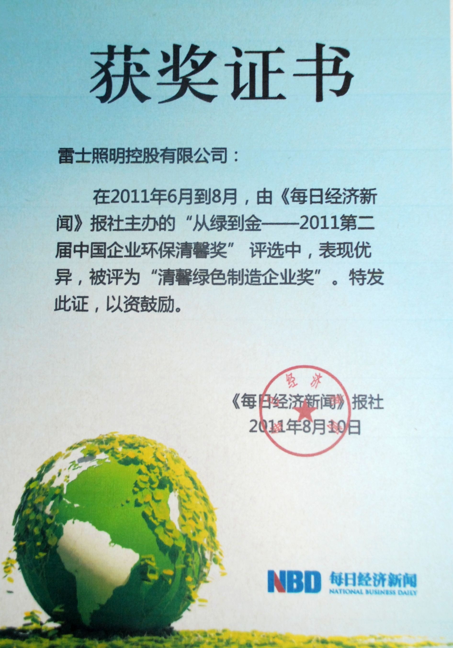 雷士綠色制造企業(yè)獎(jiǎng)