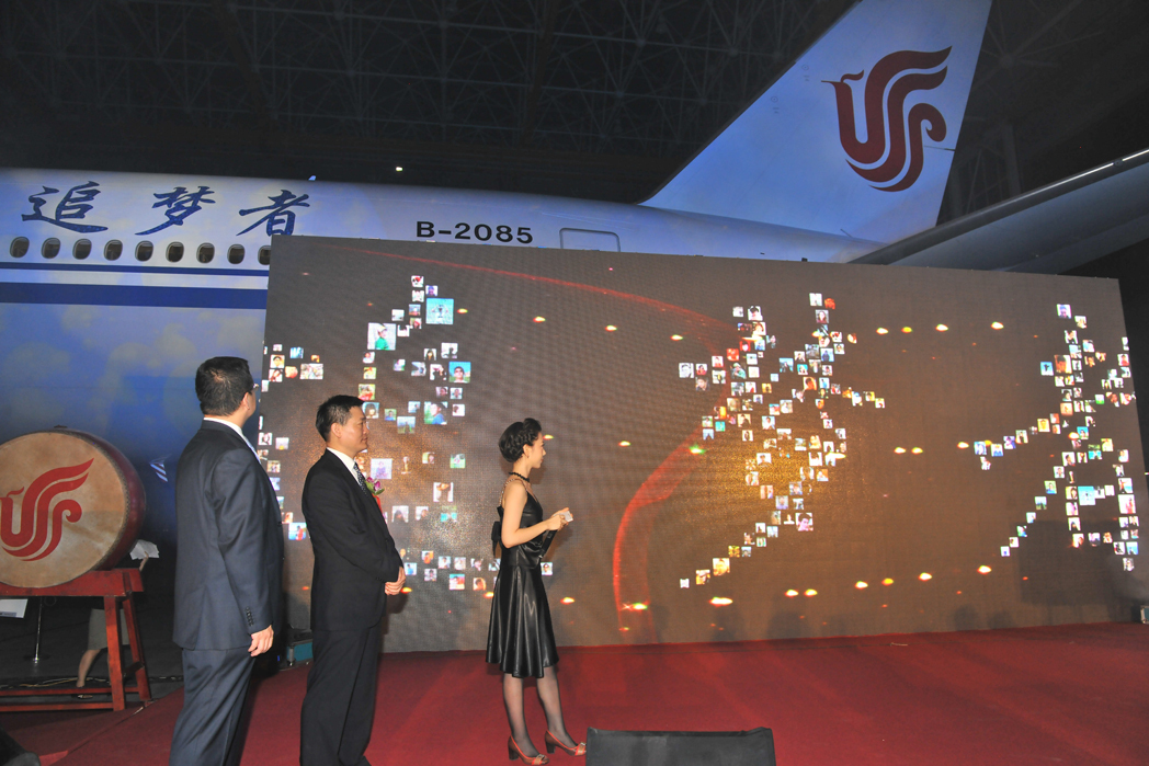 國航副總裁王明遠與波音(中國)傳播事務副總裁王玉奎共同敲響揭幕鑼鼓。伴隨著全場倒計時、激動人心的樂曲和絢爛燈光,懸掛在飛機機身的紅綢飄揚而起,噴涂于飛機機身尾部,由300名國航微博粉絲頭像組成的“追夢者”三字赫然映入全場嘉賓眼簾,全場掌聲雷鳴。王明遠親自向優勝者頒發了命名活動優勝獎 -- 兩張北京至法蘭克福往返機票,而此架飛機也將于9月1日起,攜同已經于8月投入運營的另一架國航新引進的 B777-300ER 飛機共同執行北京至法蘭克福航線?;顒蝇F場,國航還特意安排與會嘉賓登機體驗,并品嘗頭等艙、公務艙餐食和美酒。網友們也在現場弦樂隊的美妙樂曲中與自己命名的飛機共度了一個輕松美好的夜晚。