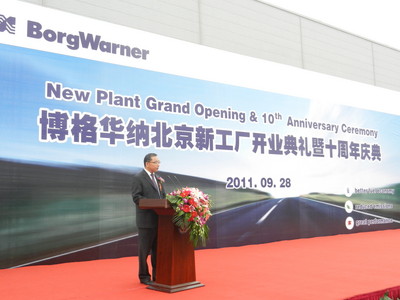 伴隨著博格華納董事會(huì)主席兼首席執(zhí)行官 Mr. Tim Manganello 先生熱情洋溢的致辭,博格華納北京新工廠開業(yè)典禮暨十周年慶典拉開序幕。Tim Manganello 先生自豪地宣布:“通過十年的不懈努力,北京博格華納成長(zhǎng)為中國(guó)市場(chǎng)上較大的分動(dòng)器生產(chǎn)企業(yè)。這是以博格華納獨(dú)有的方式 -- 領(lǐng)先的技術(shù)、質(zhì)量、生產(chǎn)和安全在中國(guó)取得成功的又一典范。博格華納會(huì)秉承與客戶合作的理念,未來將先進(jìn)的技術(shù)引入中國(guó),與中國(guó)客戶共同成長(zhǎng)。”