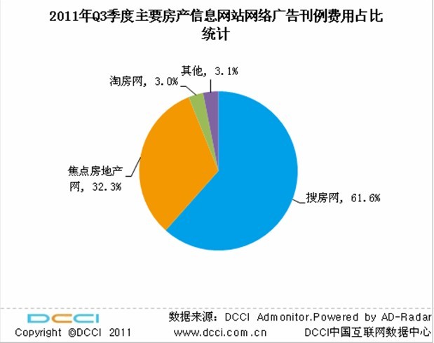 DCCI Admonitor 2011年第三季度網(wǎng)絡(luò)廣告投放監(jiān)測(cè)數(shù)據(jù)顯示,2011年第三季度專業(yè)房產(chǎn)信息網(wǎng)站的刊例費(fèi)大都出現(xiàn)了上漲,其中搜房網(wǎng)的刊例費(fèi)位居第一,達(dá)到1.70億元,焦點(diǎn)房地產(chǎn)網(wǎng)和淘房網(wǎng)位列二、三位;搜房網(wǎng)在房產(chǎn)信息服務(wù)網(wǎng)站網(wǎng)絡(luò)廣告總刊例費(fèi)用比例達(dá)到了61.6%,遙遙領(lǐng)先其他網(wǎng)站,2011年第三季度房產(chǎn)信息網(wǎng)站的廣告投放規(guī)模出現(xiàn)了明顯的增長。