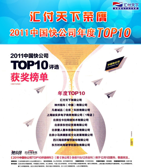 匯付天下榮膺“2011中國快公司年度 TOP10”