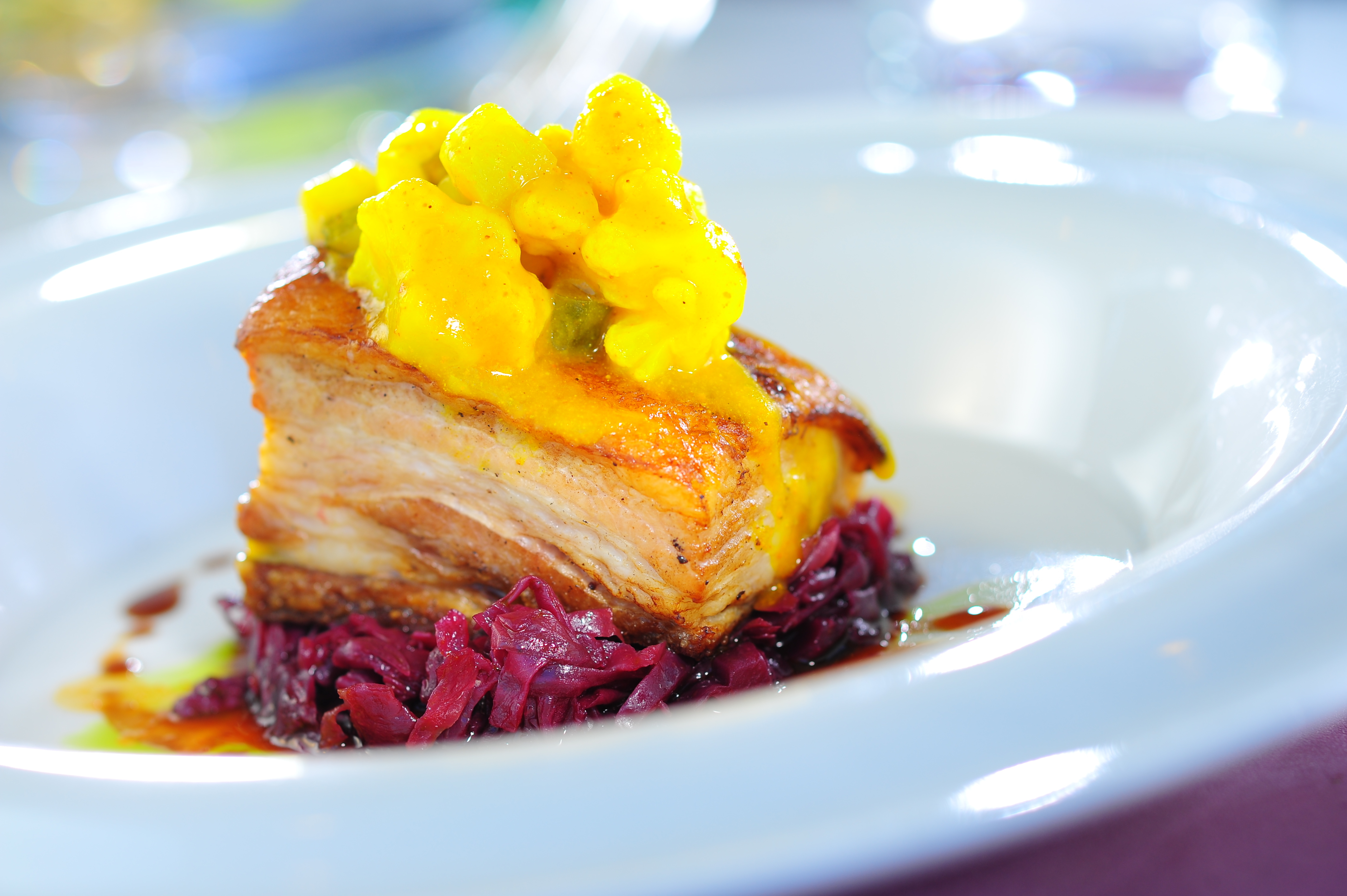面對珍稀食材,Le 188°餐廳及酒廊主廚希艾力 Eric Heijkoop 施展渾身解數,以國寶級的黑毛豬肉,編制演繹八款精致菜式,從頭盤、主菜到甜點,每一道菜式均一絲不茍地烹調并細致呈獻。慢煮西班牙黑毛豬則是主廚的首道力作,希艾力采用法國真空慢煮方式,將黑毛豬肉以攝氏四十五度慢煮四十八小時,令肉質內外均衡,保持水份,同時加入紅酒洋蔥、羅勒及紅咖哩蘭度豆汁,成就此款不可多得的經典主打菜式。而香煎西班牙黑毛豬配照燒菠蘿、西紅柿沙律及牛仔汁則是黑毛豬的另一精彩演繹。自制甜甜酸酸的菠蘿與牛仔汁從香脆的黑毛豬肉外層緩緩滲入內層,提升肉質散發的橡子幽香,甜酸而甘香,口感濃郁細膩,層層相扣,更是秋冬季節的開胃佳肴。