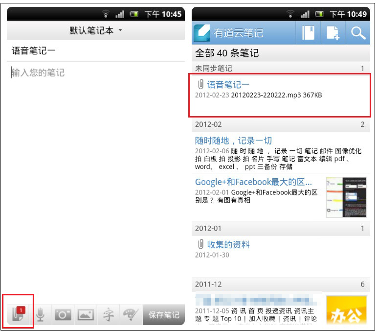 為了讓用戶在使用手機(jī)時(shí)能快速記錄大量的信息,并在手機(jī)和電腦之間進(jìn)行自動(dòng)同步,有道云筆記 Android1.2 版增加了錄音筆記功能,用戶不僅可以直接把需要記錄的內(nèi)容說(shuō)出來(lái)保存在筆記里,也可以在會(huì)議、采訪的過(guò)程中使用有道云筆記進(jìn)行錄音,錄音結(jié)束后點(diǎn)擊保存同步,這段錄音就能同時(shí)出現(xiàn)在用戶的電腦上了。