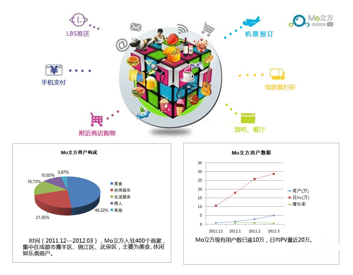 成都2012年4月12日電 /美通社亞洲/ -- 據(jù)摩寶統(tǒng)計,從2011年12月Mo立方上線,截止到目前,入駐Mo立方的商家數(shù)量已突破400個, 這是自2011年2月約翰· 杜爾第一次提出“SoLoMo”概念以來,生活類O2O的又一次成功運用。專家預估,本地生活消費類O2O是目前市場上唯一可能產(chǎn)生超級電商企業(yè)的領域,未來5年一定會誕生一個跟淘寶并駕齊驅,甚至超過淘寶的電商巨頭。