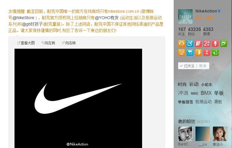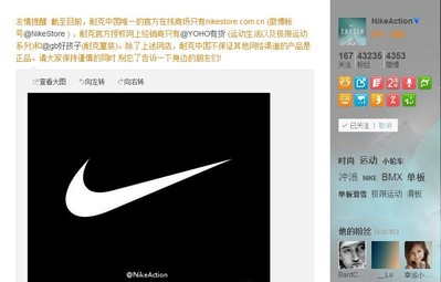 微博原文:“友情提醒:截至目前,耐克中國唯一的官方在線商場只有 nikestore.com.cn,耐克官方授權網上經銷商只有‘YOHO!有貨’(運動生活系列及極限運動系列)和‘好孩子’(耐克童裝)。除上述網店,耐克中國不保證其他網絡渠道的產品是正品。請大家保持謹慎的同時,別忘了告訴一下身邊的朋友們!”