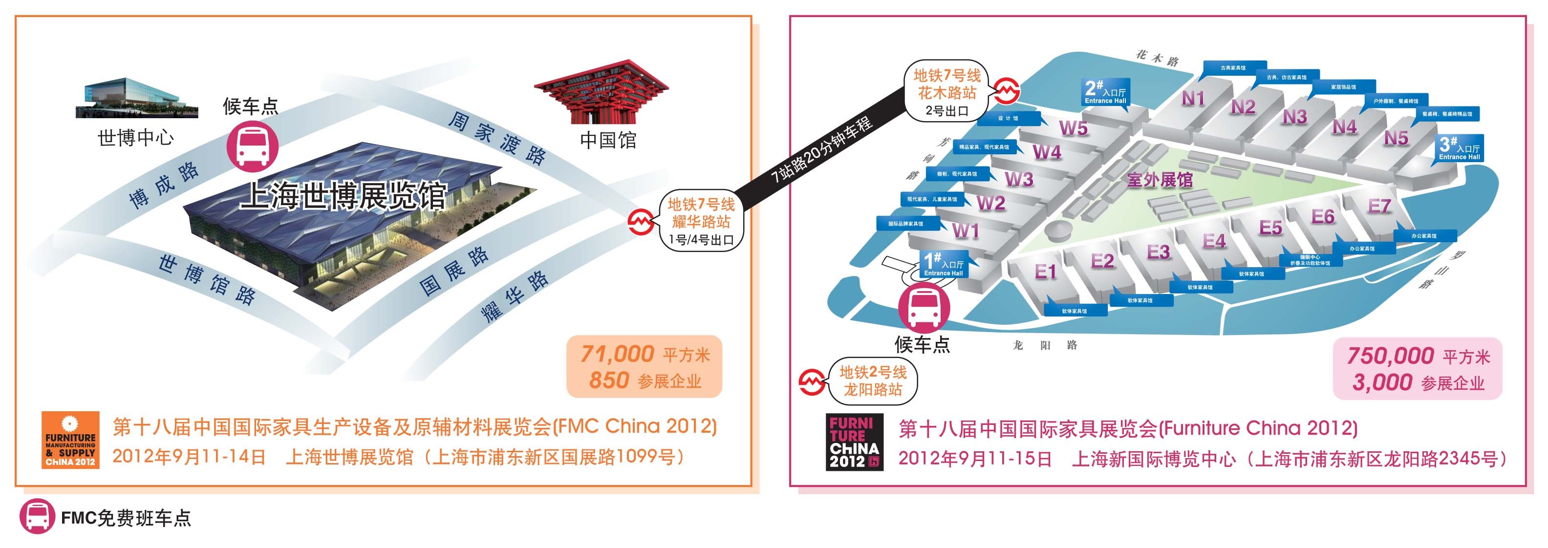 2012年9月11-14日,在上海新國際博覽中心同期家具展中17個場館的顯著位置開設20平米的展示專區。匯集多個家具生產設備及原輔材料方面優秀的新產品及新技術,再輔以極具創意的展臺設計和精彩互動,必將引起業內人士和買家的廣泛關注。同時,在家具展中設置展示專區也為FMC參展展商提供了又一個對外交流的平臺和更多的商機,同期將吸引超過3,000家展商,100,000觀眾的關注。