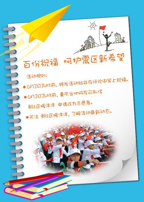 網(wǎng)友可以關(guān)注“@社區(qū)暖洋洋”,并在6月2日前在評(píng)論中寫下對新金帶小學(xué)孩子們的兒童節(jié)祝福。沃爾瑪及員工志愿者為孩子們準(zhǔn)備了百套嶄新的文具,并將于“六一”之后回訪新金帶小學(xué)。屆時(shí)志愿者們會(huì)將征集到的網(wǎng)友祝福和文具、圖書等學(xué)習(xí)用品一起送到孩子們手中。重慶網(wǎng)友還可通過私信方式報(bào)名,部分網(wǎng)友代表將有機(jī)會(huì)同沃爾瑪志愿者一起參加回訪活動(dòng),親自為孩子們送去祝福。