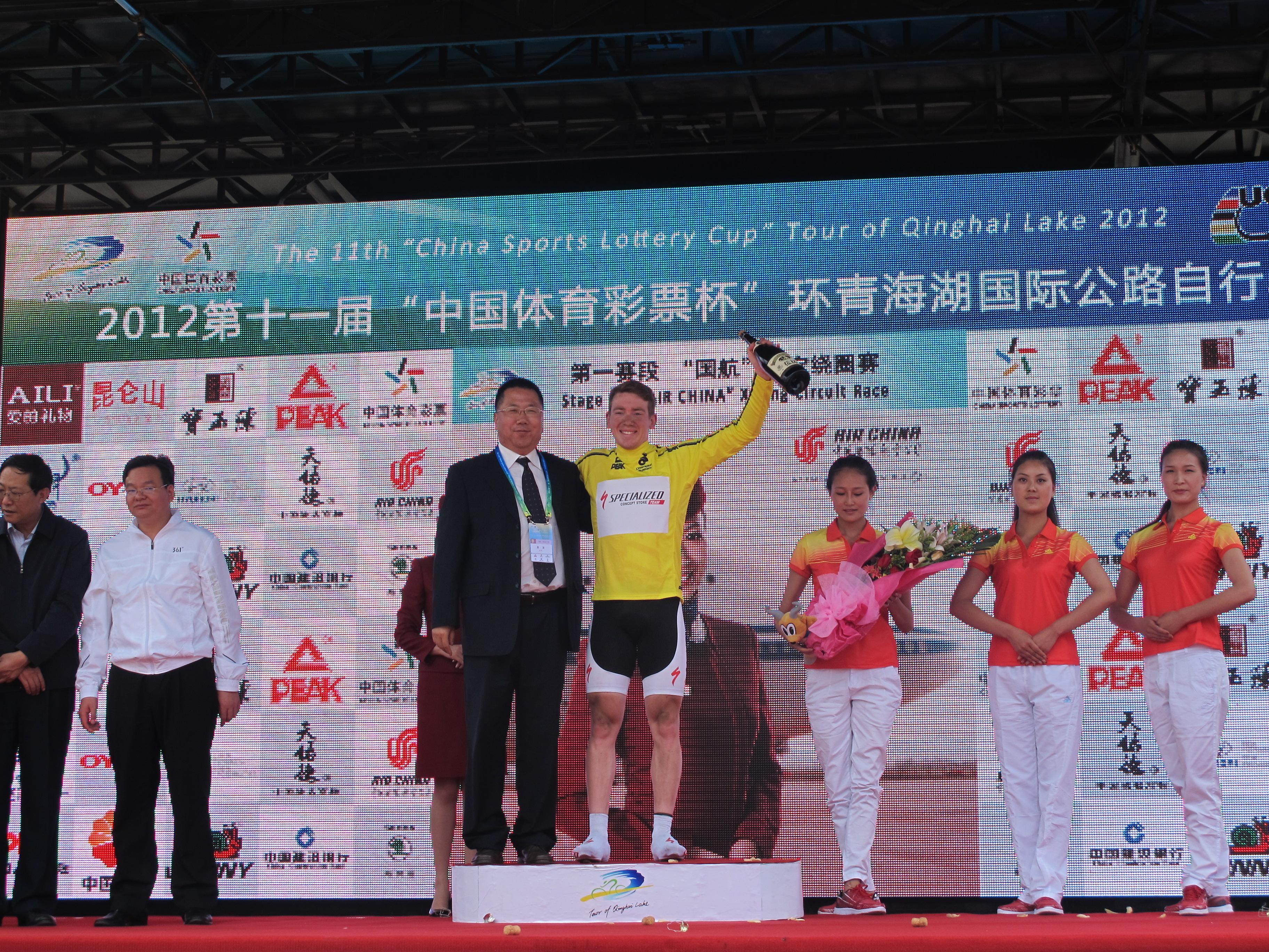 國航成功贊助2012環青海湖自行車賽,圖為國航商委銷售部副總經理劉偉和西寧繞圈賽賽段冠軍德國SCS隊選手法比安