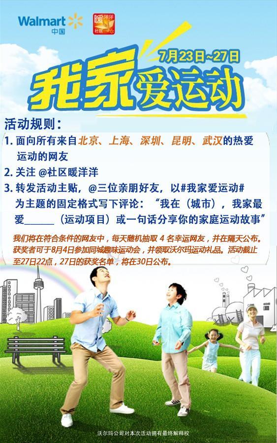 沃爾瑪公益微博“@社區暖洋洋”啟動“我家愛運動”活動,號召網友積極參與全民健身。