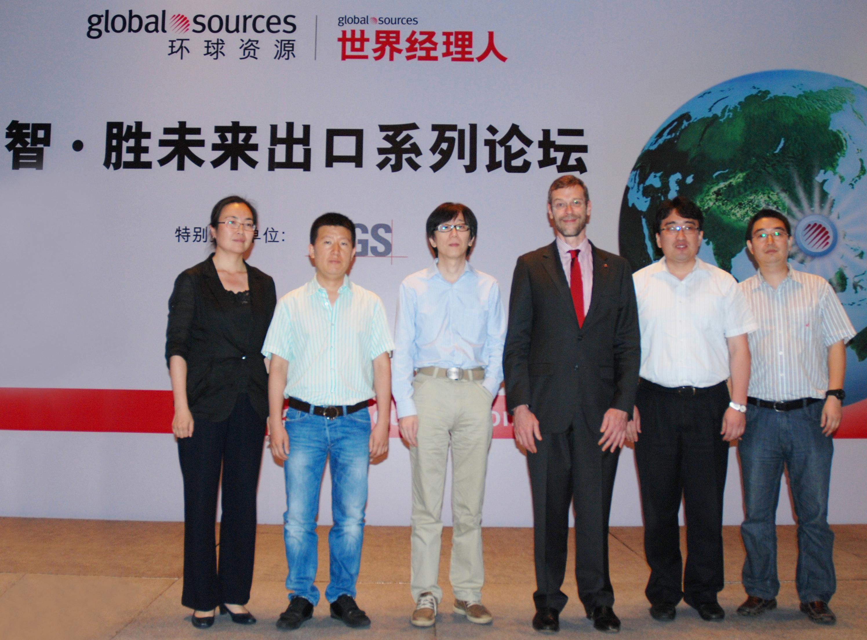 論壇主辦方環(huán)球資源企業(yè)事務(wù)總裁兼《世界經(jīng)理人》雜志出版人裴克為先生(右三)與SGS通標(biāo)標(biāo)準(zhǔn)技術(shù)服務(wù)有限公司高級技術(shù)經(jīng)理盧耕博士(左三)及其他嘉賓在環(huán)球資源“智.勝未來出口系列論壇”青島場活動(dòng)上合影。