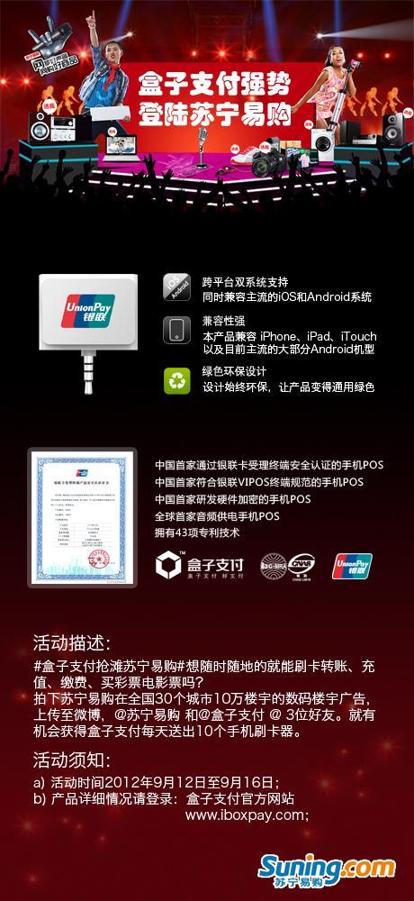選擇盒子支付的手機POS支付方式,對在蘇寧易購上購物的消費者來說,有銀聯提供安全技術保障,金融級的支付信心保證,通過真正的手機POS刷卡消費,驗證磁道信息,較無卡和在線的支付方式,風險降低75%以上。消費者無需開通網銀,交易也不再受到銀行卡和卡種的限制。