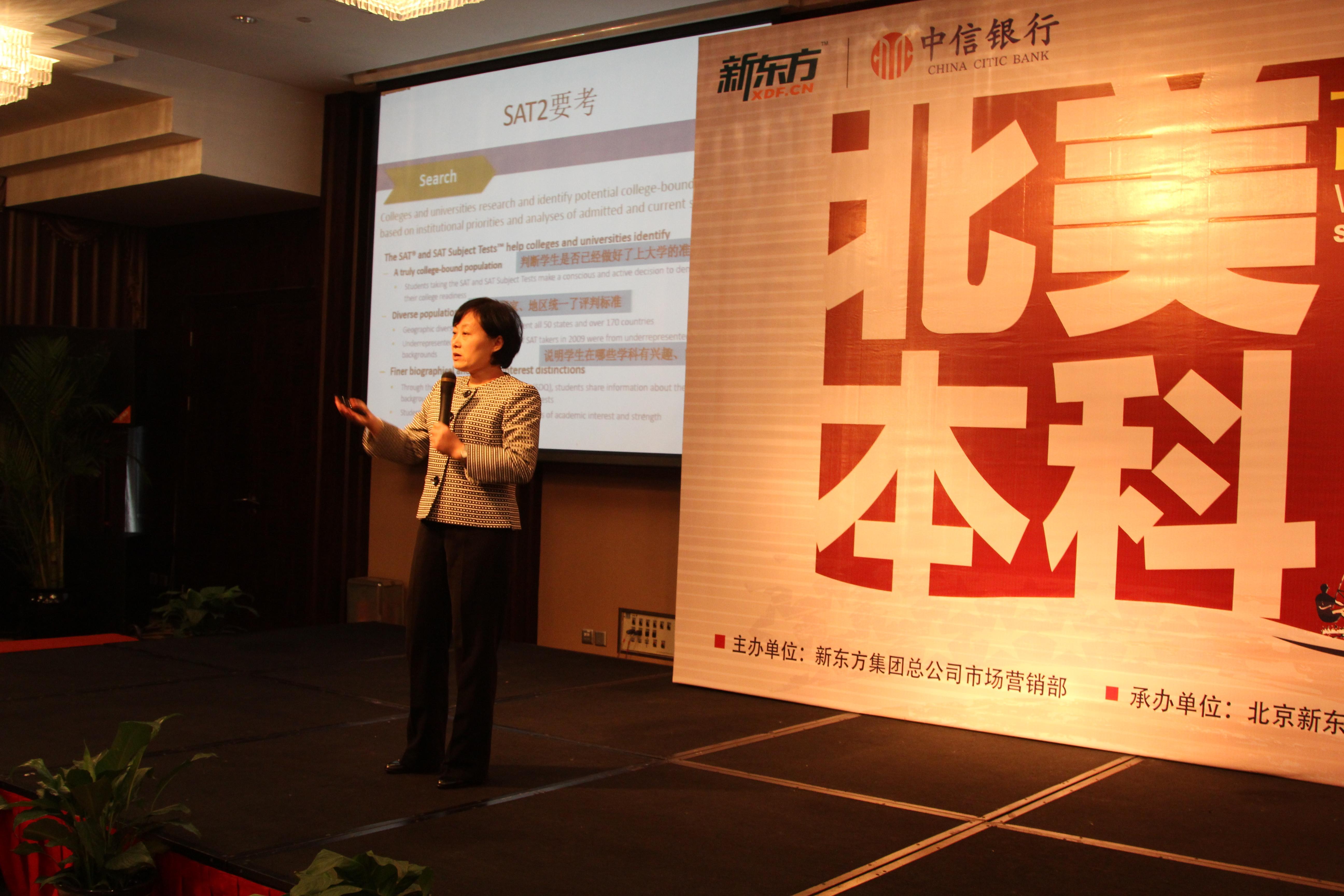來(lái)自北京新東方的托福、SAT高分學(xué)員還在現(xiàn)場(chǎng)分享了自己的備考經(jīng)驗(yàn)。來(lái)自北京171中學(xué)的張同學(xué)取得了托福考試111分,SAT考試2210 的好成績(jī)。他介紹,之所以取得較好的成績(jī)?cè)谟趦牲c(diǎn),一是考試之前長(zhǎng)時(shí)間的積累,二是考前短期熟悉考試形式。平時(shí)多聽(tīng)VOA、多背誦美文、多讀英文小說(shuō)并通過(guò)“自言自語(yǔ)”的方式練習(xí)口語(yǔ)是平時(shí)提高英語(yǔ)水平的方法。而在SAT考試中,張同學(xué)則建議大家大量閱讀,掌握單詞并大量做題掌握考試形式。來(lái)自北京八中的郭同學(xué)取得了托福117分、SAT2260分的好成績(jī)。她介紹,面對(duì)考試平時(shí)的積累最為重要。面對(duì)SAT閱讀,一定要養(yǎng)成好的閱讀習(xí)慣,客觀面對(duì)自己的英文水平并挑選適合自己的、感興趣的英文書籍進(jìn)行閱讀以便提高閱讀速度。而面對(duì)數(shù)學(xué)單項(xiàng),中國(guó)的學(xué)生尤為注意的是不要粗心。面對(duì)寫作單項(xiàng),除了要做好閱讀積累還要對(duì)語(yǔ)法有扎實(shí)的掌握。