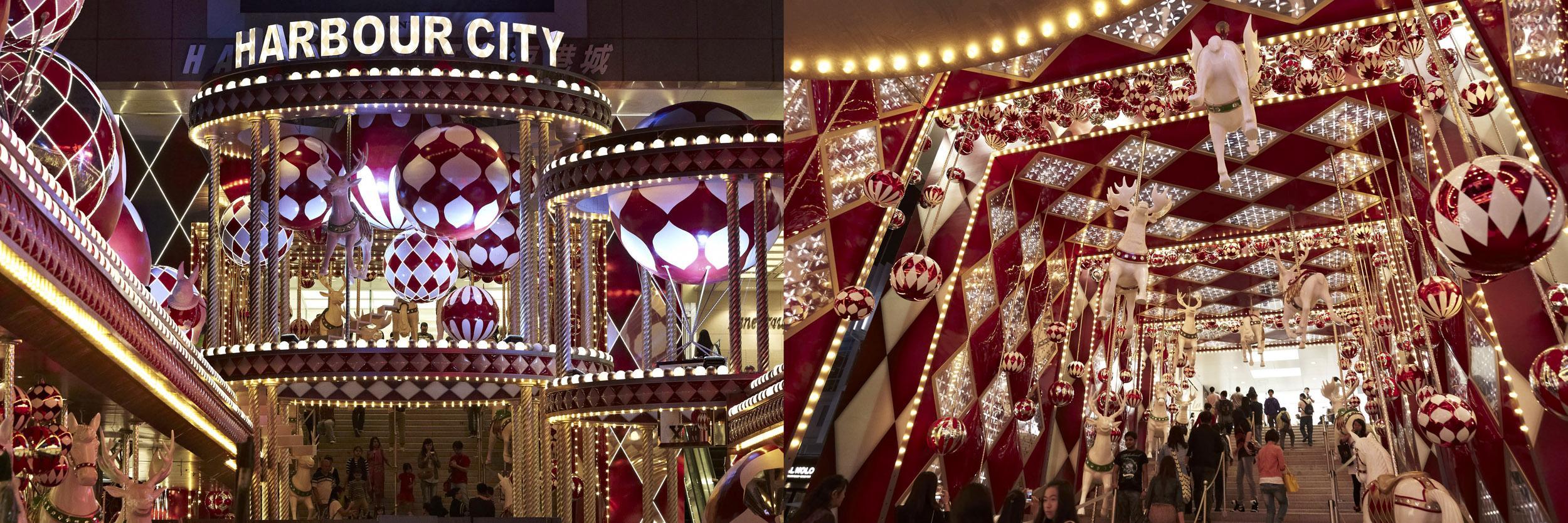 海港城今年的圣誕主題為“圓滿愛”,海港城海運大廈露天廣場的圣誕布置以“旋轉木馬”和“夢幻馬戲團”為設計概念。《圣誕圓滿愛》布置360度全景夢幻馬戲圣誕游樂園以充滿圣誕氣氛的紅白雙色作主調,60多只生動可愛的圣誕鹿、白馬和小兔子遍布整個廣場。