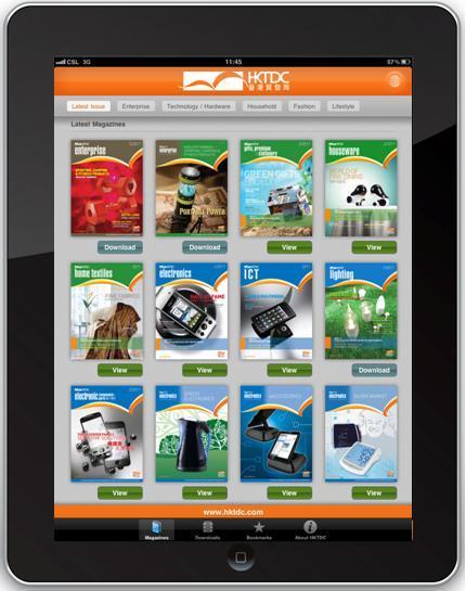 所有香港貿發局產品雜志及專題特刊集合于一個“書架式”平臺。 買家只需在App平臺下載此應用程序,即可隨時免費下載最新的雜志,瀏覽廣告商的產品資訊。互動功能包括:產品關鍵字搜尋、電郵分享廣告、實時詢盤、支持影片播放、連結至供應商網頁