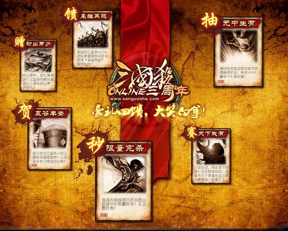 2012年12月25日,末日后的首個(gè)圣誕節(jié),《三國(guó)殺OL》三周年慶典也在此時(shí)拉開(kāi)大幕,新老玩家齊聚一堂,六大活動(dòng)人滿為患。官方提供的專(zhuān)屬尊貴禮包、既威武又賣(mài)萌的精美三國(guó)秀、超值的武將促銷(xiāo)、以及手機(jī)、平板電腦等實(shí)物大獎(jiǎng),100%的中獎(jiǎng)率贏得了玩家的瘋狂參與。