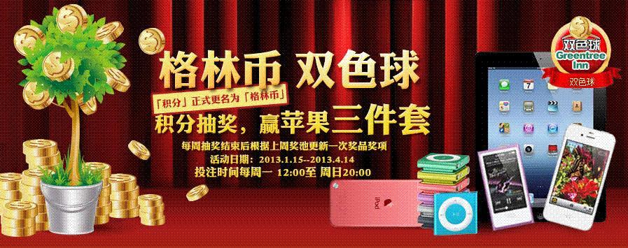 上海2013年1月24日電 /美通社/ -- 2013年1月15日至2013年4月14日,格林豪泰酒店管理集團全新推出“格林幣 雙色球”活動,感謝廣大客人長期以來對格林豪泰的支持,也希望在新的一年里能給廣大客人帶來好運。