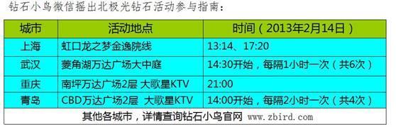2月14日當(dāng)天只要在所在城市指定的地點(diǎn)參與鉆石小鳥(niǎo)微信搖一搖活動(dòng)便可獲贈(zèng)鉆石小鳥(niǎo)北極光鉆石及其他精美禮品。