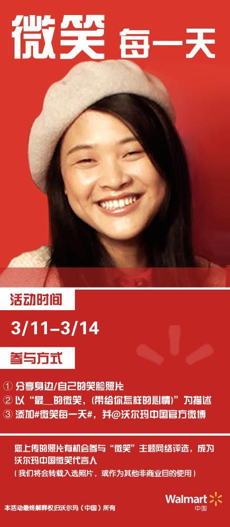3月12日至22日,@沃爾瑪中國官方微博將開啟第一個小行動“微笑每一天”,號召人們每天給自己和身邊人多一次微笑,為日常生活增添一份友好和積極的態度。3月12日至3月14日期間,消費者可以用#微笑每一天#話題標簽,將自己或身邊人的笑臉照片和心情分享至新浪微博,將有機會入選沃爾瑪“最美的微笑”網絡評選,成為沃爾瑪微笑代言人。