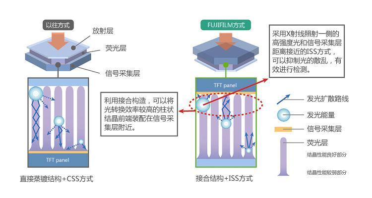 用于一般間接變化型FPD的CSS(Conventional Side Sampling,即傳統的透過側采集)方式中,X射線照射部位設置熒光層,發射部位設置信號采集層 (TFT panel)。CSS方式下,X射線發射部位發出的高強度光在到達信號采集層的過程中,容易發生衰減和散亂,使X射線信息損失較大。另一方面,在富士膠片獨有的“ISS技術”中,在X射線照射部位設置信號采集層,縮短了X射線在到達信號采集層之前經過的的距離,從而可以有效接收X射線檢測出發出的光。此外,沒有采用將CsI柱狀結晶之直接蒸鍍于信號采集層,形成CsI柱狀結晶的一般“直接蒸鍍結構”,而是采用了光轉換效率高,結晶性能優越的CsI柱狀結晶先頭部分和信號采集層貼合的“接合結構”,從而使高畫質化成為可能。(請參考圖1)