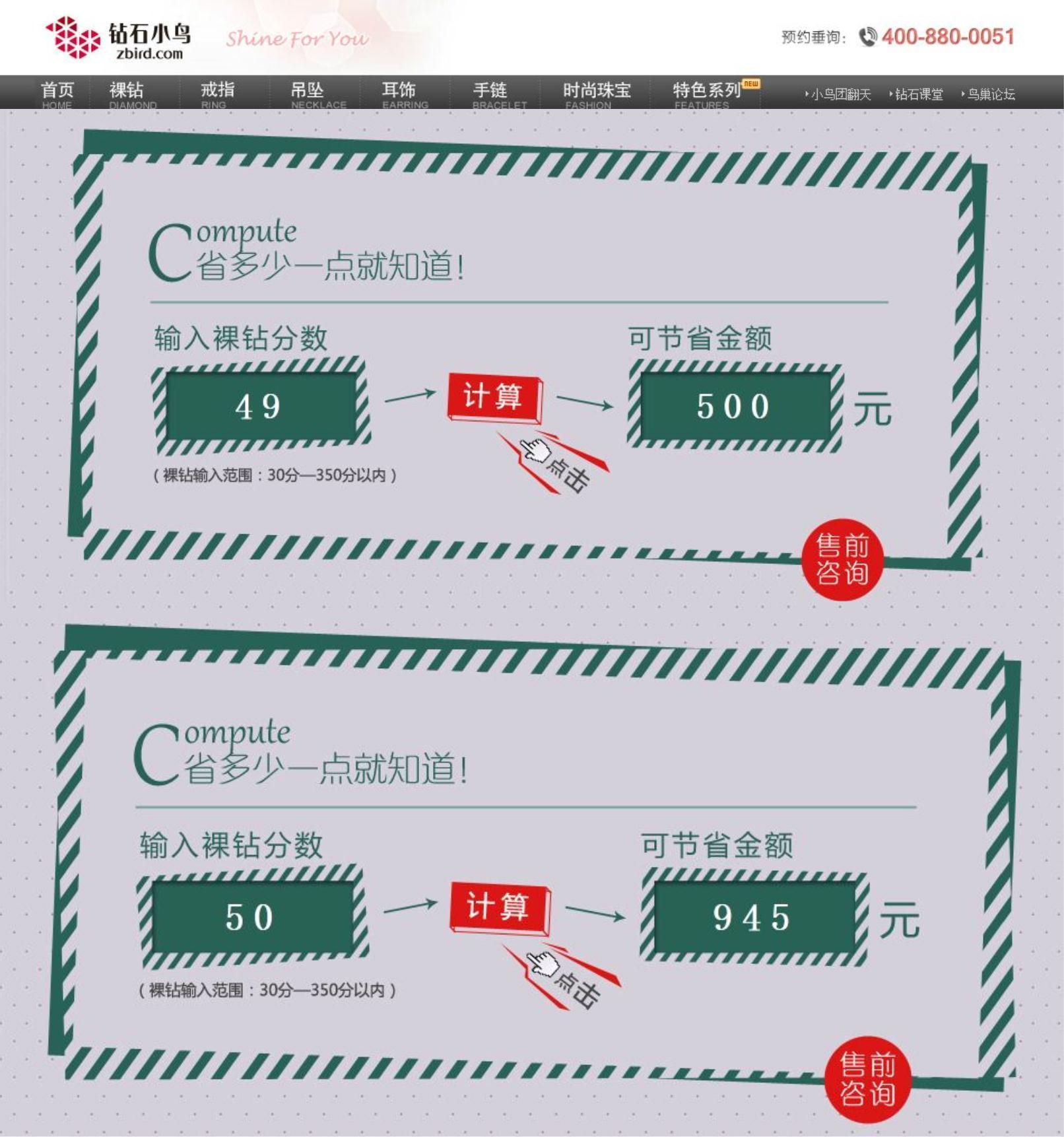 王小姐說:“本來因為結(jié)婚的預(yù)算有限,只打算買30多分的裸鉆,對比后發(fā)現(xiàn),鉆石小鳥的價格比商場專柜要省40%左右,于是就買了50分的,剛好最近看到五一促銷的這個活動的訊息,我特地算過,49分與50分鉆石相比的話,49分可省500元,而50分卻能省945元。”