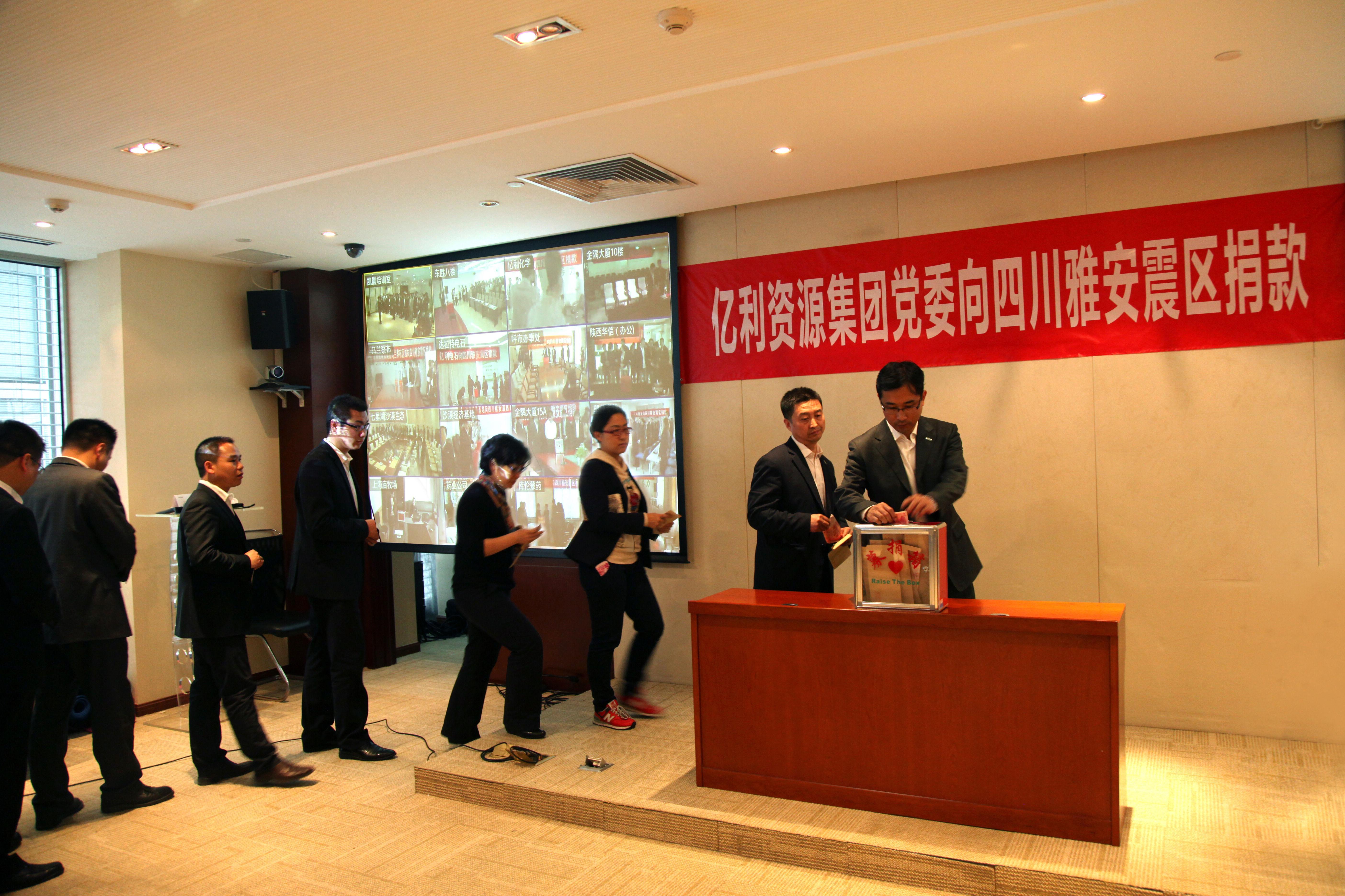 北京2013年4月28日電 /美通社/ --  4月27日,四川省雅安蘆山發生7.0級地震后的第七天,億利資源集團黨委組織億利公益基金會、公司全體黨員干部和職工舉行向雅安地震災區捐款活動。