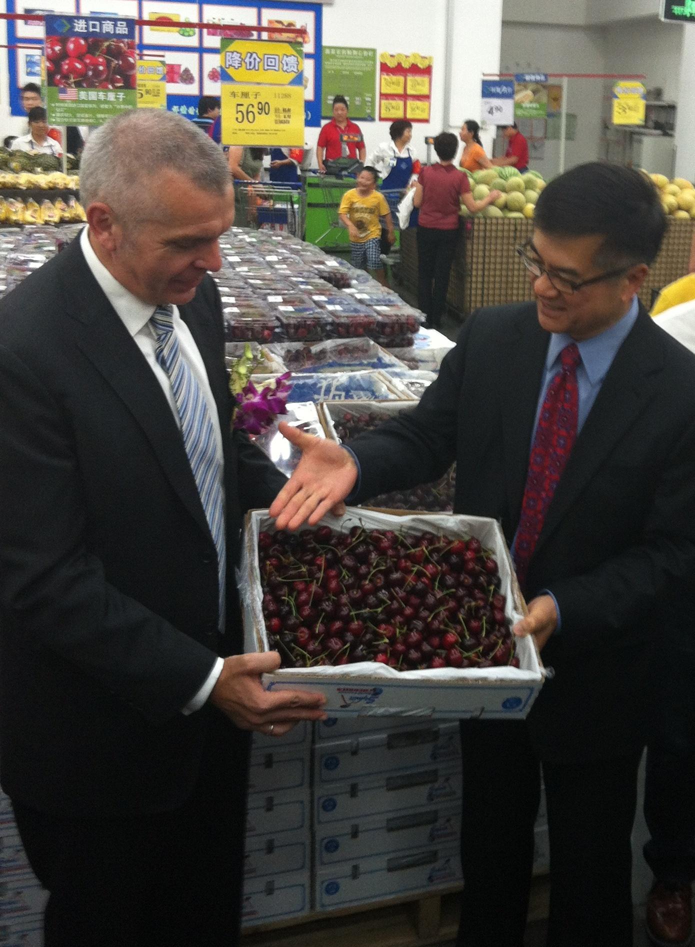 山姆會員商店首席運營官文安德與美國駐華大使駱家輝一起在北京亦莊山姆會員商店促銷美國西北櫻桃。