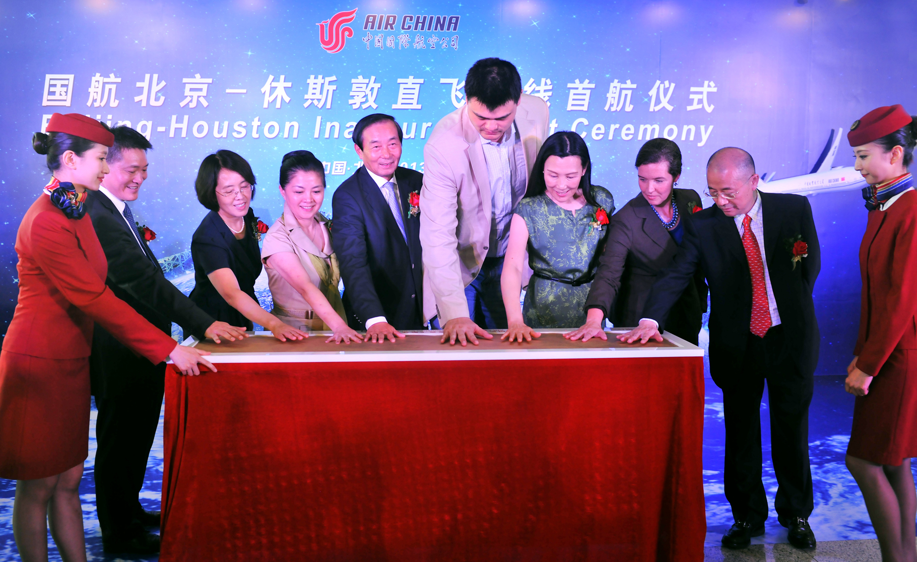 北京2013年7月12日電 /美通社/ -- 2013年7月11日13時,中國國際航空股份有限公司(以下簡稱“國航”)北京-休斯敦直飛航線首航儀式在首都機場3號航站樓舉行。中國民用航空局副局長夏興華、中國駐休斯敦總領(lǐng)事許爾文、美國駐中國大使館參贊孫曉雅(Sandra Oudkirk)、中國航空集團黨組書記王銀香、國航黨委書記樊澄、副總裁王明遠、北京首都國際機場股份有限公司黨委書記李小梅以及休斯敦親善大使、前休斯敦火箭隊籃球巨星姚明應邀出席首航儀式。