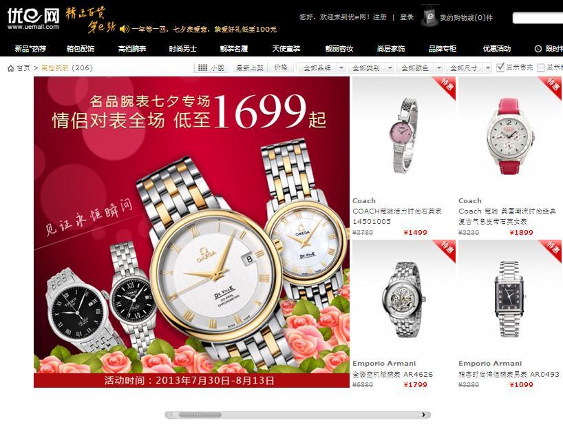 上海2013年8月1日電 /美通社/ -- 中國的情人節(jié)即將到來,為了讓所有情侶在七夕節(jié)有一個難忘的回憶,優(yōu)e網(wǎng)精選出百余款新品讓利回饋新老朋友。參加此次促銷活動的品牌涉獵品類有對表、包包配飾、家居、美妝等。本季較大亮點莫過于大牌情侶表的火熱上線,有Emporio Armani、浪琴、Tissot、歐米茄等,其中Emporio Armani情侶對表的促銷價格僅有1699元,更多情侶表也以優(yōu)惠的價格呈現(xiàn),大氣簡約的風格和特質(zhì)亦是辦公白領(lǐng)和情侶所鐘愛的。送一款禮重情也重的定情信物,定能讓TA時刻感受到你的愛意。