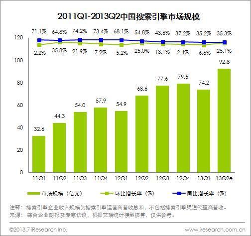 2013Q2中國(guó)搜索引擎市場(chǎng)規(guī)模92.8億,環(huán)比回升