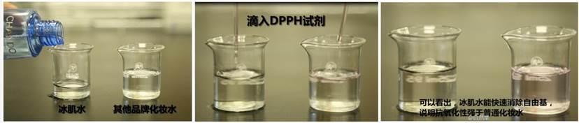 分別在冰肌水和其他品牌化妝水中滴入DPPH試劑(DPPH是一種穩定的自由基,常用于抗氧化實驗),約幾分鐘后,冰肌水(左側)與自由基融合消除,試劑顏色恢復透明。由此可見,冰肌水的抗氧功力確實很強大。