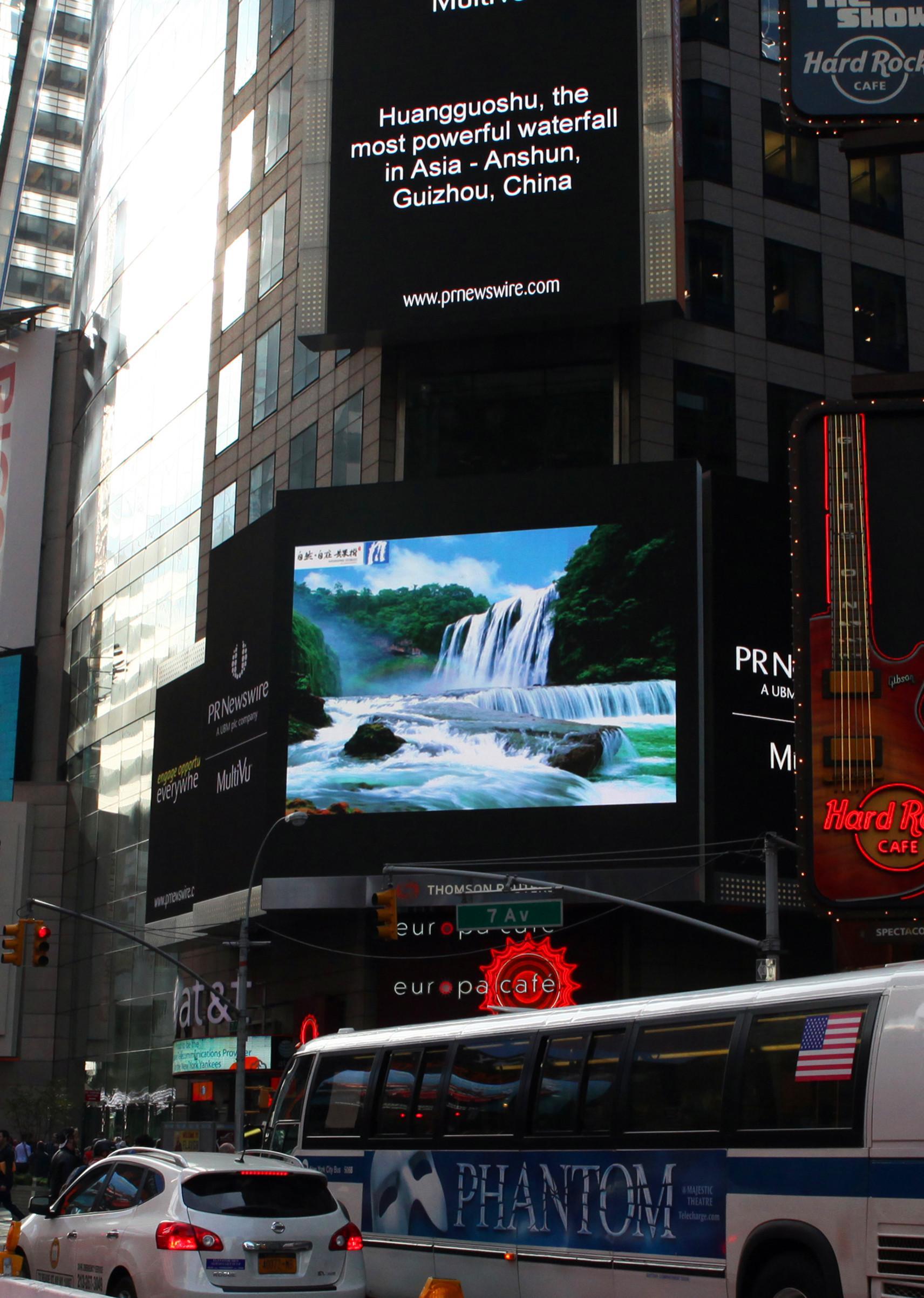 中國安順2013年10月17日電 /美通社/ -- 2013年10月14日,紐約時代廣場大屏刊登了1幅黃果樹瀑布壯麗景觀的圖片,以《黃果樹,亞洲壯觀的瀑布》為題對黃果樹景區進行了報道,這是貴州省景區在海外推廣中首次成功登陸紐約時代廣場。
