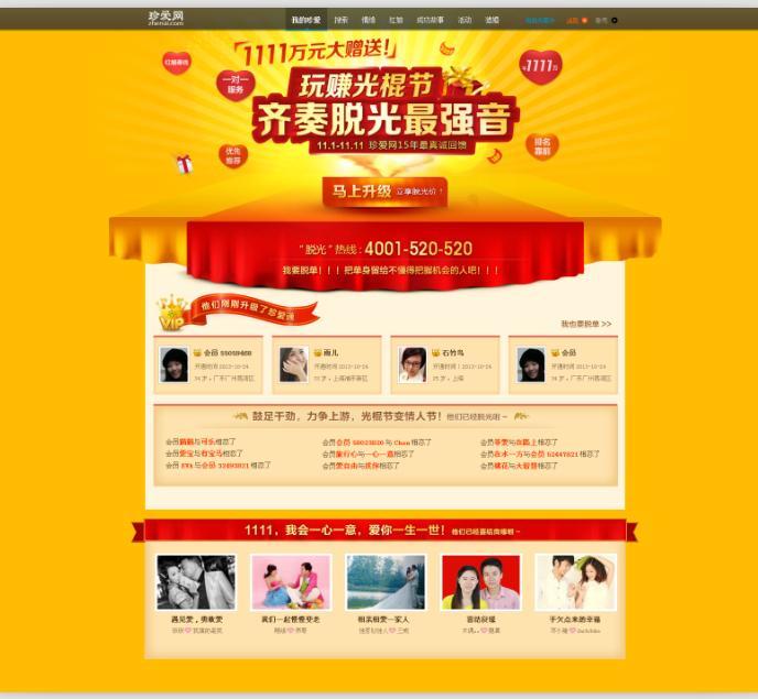 吃喝玩樂之余別忘了脫光這件人生大事!活動期間珍愛網線上全線網站產品均有大優惠,每天完成指定任務參與抽獎定將提高脫光幾率,珍愛通VIP會員更有前所未有的特大回饋,1111萬人工紅娘大回饋誠意陪伴你光棍節不孤單!
