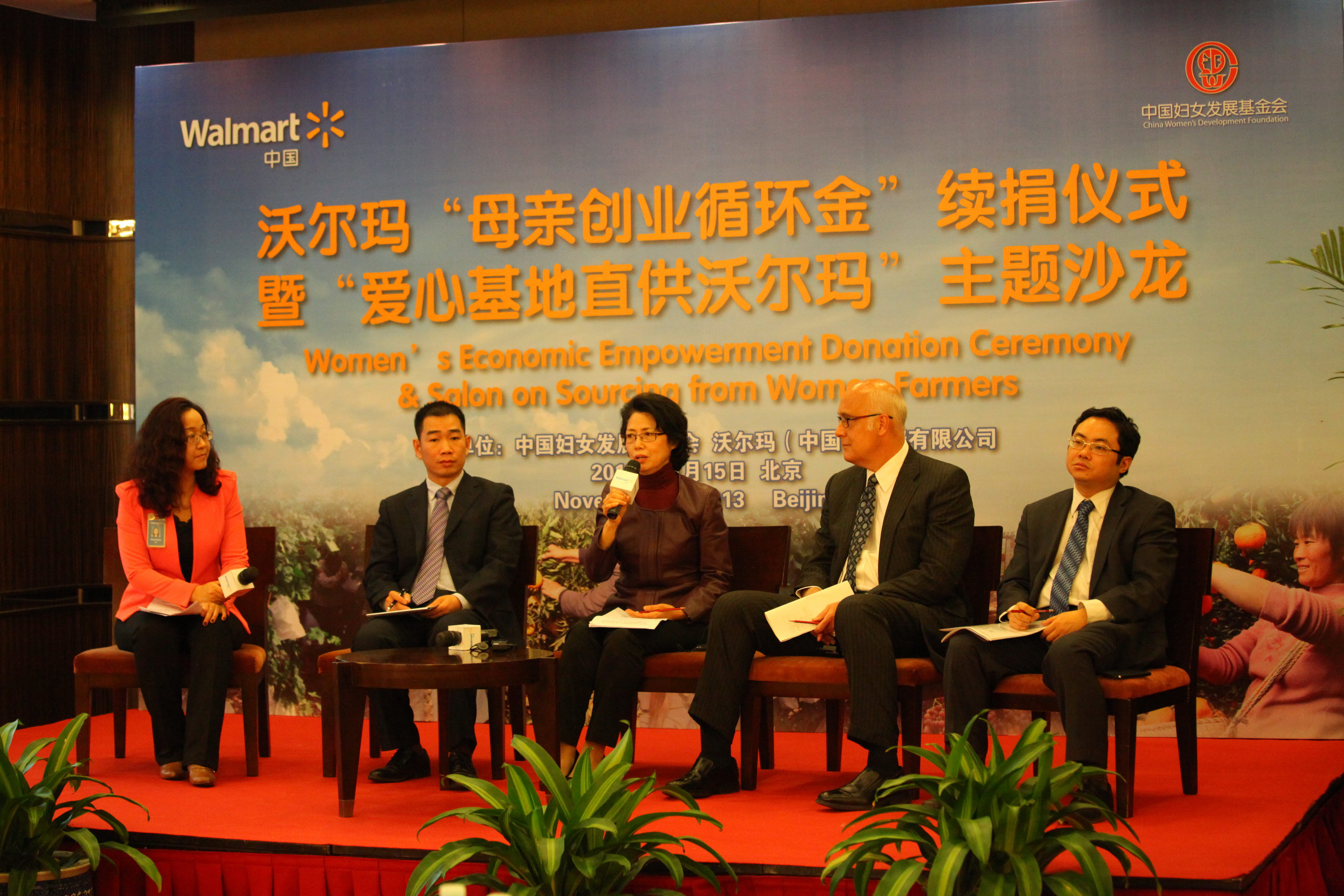 中國婦女發展基金會秘書長秦國英,沃爾瑪中國公司事務高級副總裁博睿(Raymond Bracy),以及來自公益領域的專家、學者等嘉賓出席了今天舉行的“母親創業循環金”續捐儀式以及“愛心基地直供沃爾瑪”可行性研討。