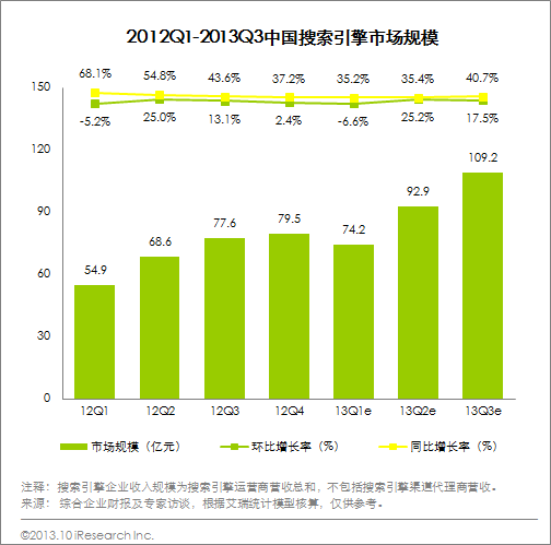 2013Q3中國搜索引擎市場規模109.2億,增速抬頭