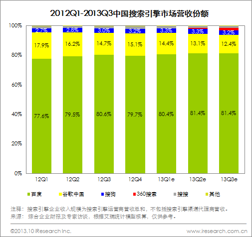 圖:2012Q1-2013Q3中國搜索引擎市場營收份額