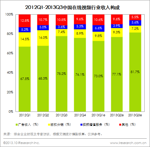 2013Q3,在線視頻行業(yè)營(yíng)收份額較高的業(yè)務(wù)類(lèi)型依然是廣告,其占比高達(dá)81.7%,分別較2013Q2和2012Q3上漲4.6個(gè)和3.5個(gè)百分點(diǎn)。