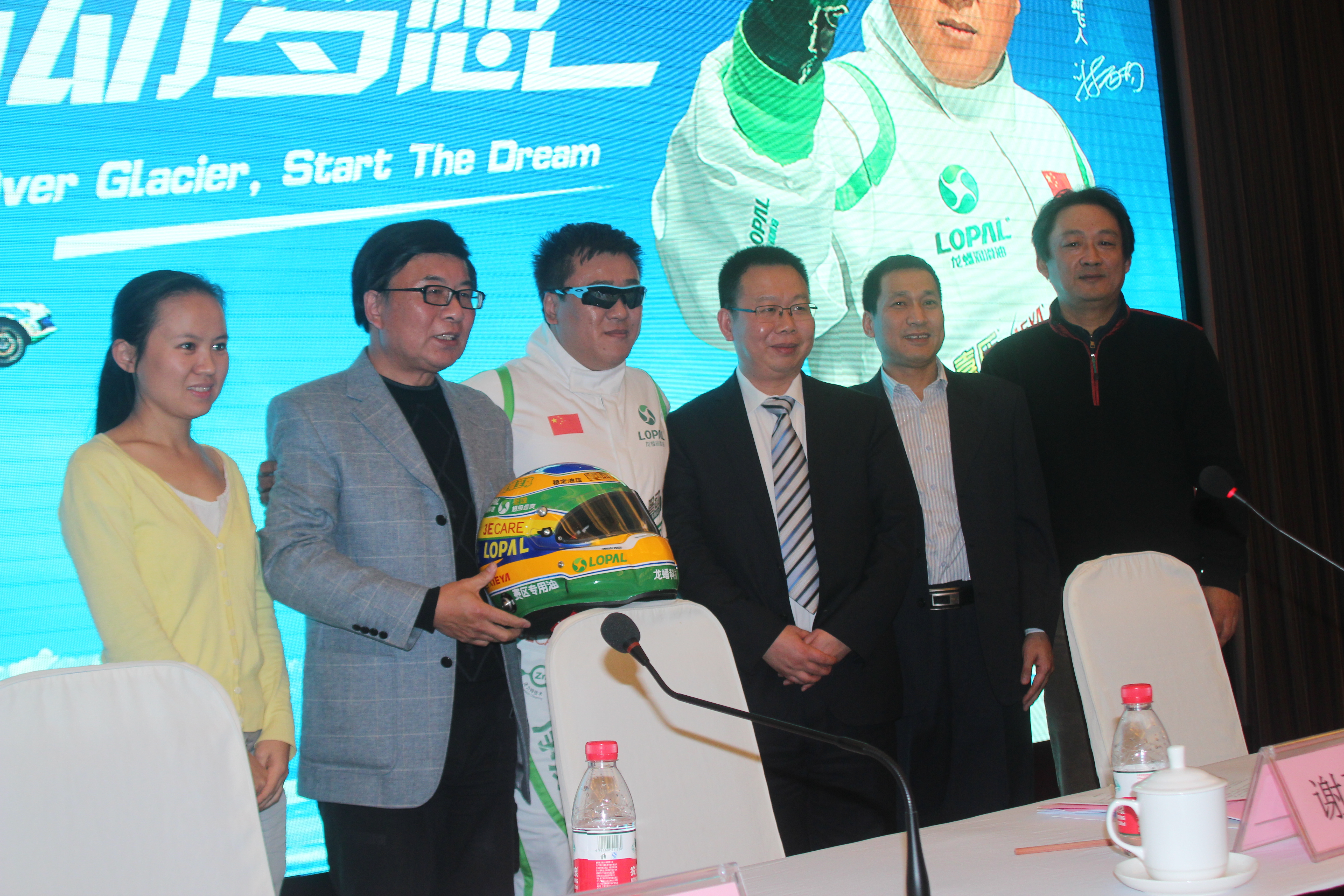 從左依次:搜狐網新聞副總編周蓉、中央電視臺著名主持人韓喬生、飛越車手謝雨均、活動主辦方--江蘇龍蟠石化總經理石俊峰、活動協辦方--黑龍江省黑河市旅游局常務副局長張寶紅、活動支持方--江蘇大唐靈獅廣告有限公司總經理吳綱